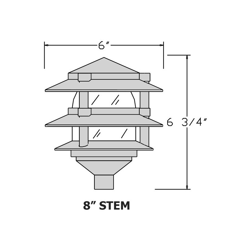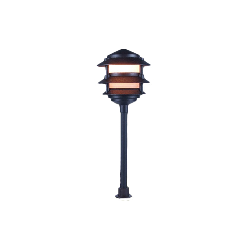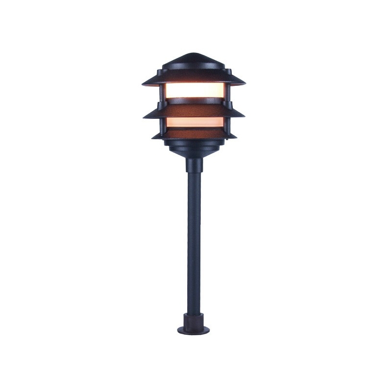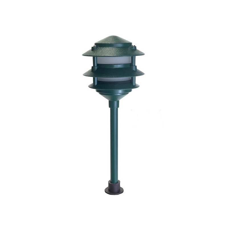 120V A19 LED outdoor Cast Aluminum 14.75" tall three tier pagoda light. Price includes a heavy duty composite PVC stake. See below for LED bulb options available for this light: