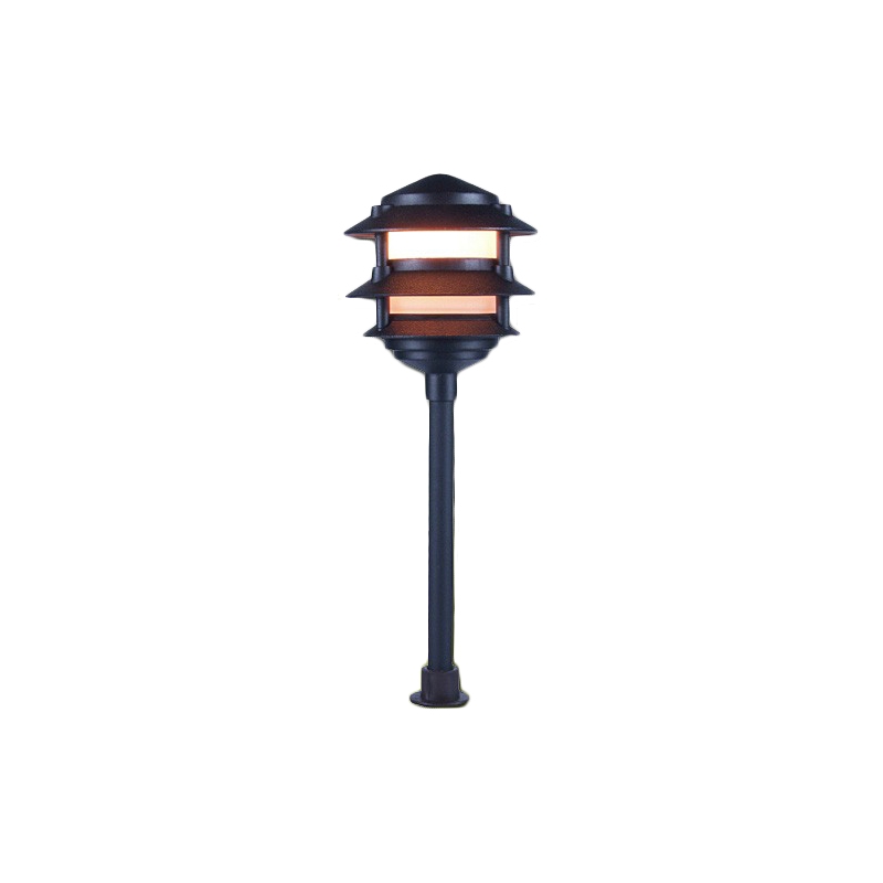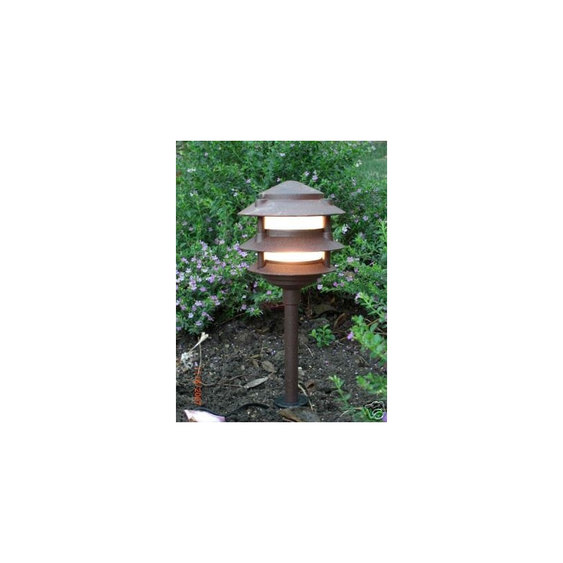 12V low voltage 6W A19 LED outdoor Cast Aluminum 14.75" tall three tier pagoda light. Price includes a heavy duty composite PVC stake. See below for LED bulb options available for this light: